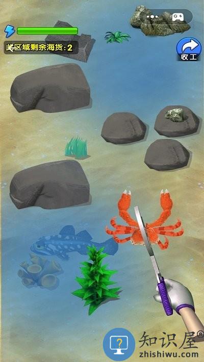 玩法和操作都很简单,玩家需要在场景里移动并寻找海货,点击即可抓取;