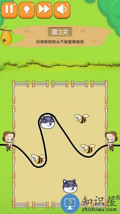 3、考验的你益智 画条线来帮助狗狗完成闯关;