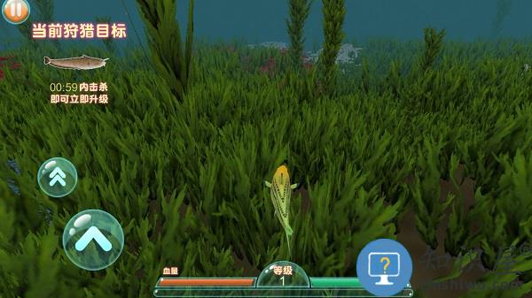 3、滑动屏幕控制鱼儿游动,使用攻击键啃咬其他鱼类,吞噬成长。