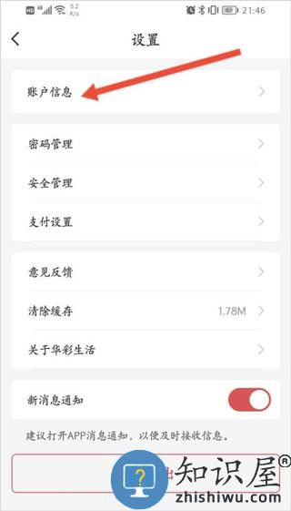 1、进入手机的华夏银行华彩生活app,点击我的选项。2、点击右上角的设置选项。3、点击上面的账户信息。