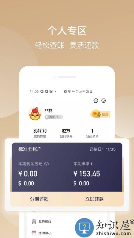 【我的】账单查询、积分管理、我的额度、卡片管理、订单管理、自动还款、活动中心、我的权益、我的闪卡、推荐办卡、推荐进度查询、ETC迅卡、云闪付、网点查询等自助通道,随时为您服务。