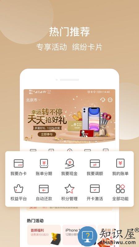 【首页】全新界面精品推荐,信用卡产品展示与申请、优惠活动宣传与推广、消费及商城分期、开卡激活与积分兑换、头条热门公告、本地服务商户接入等板块,整合优质商户资源。