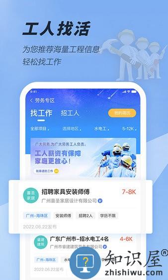 每天海量招工信息在线发布,海量工友在线找活,满足老板工人的在线招工找活需求,让建筑办工更高效、更智能、更便捷!