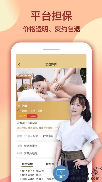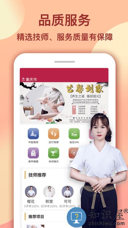1、上门服务:可以根据自己的身体情况,选择适合的按摩项目,查看项目介绍,筛选技师。