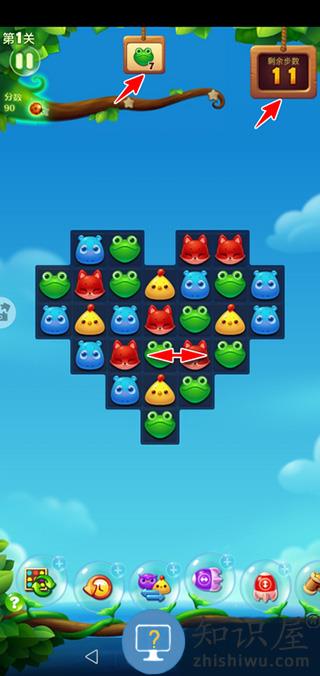 2、等到过关开始以后,页面上方正中将会出现一个任务牌,提示当前要完成的任务(比如这里是要消除10个青蛙);右上角会出现本关可用步数(比如这里是12步)。