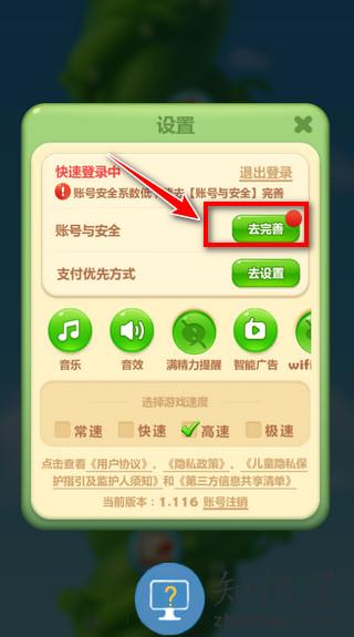 5、在开心消消乐的设置中,选择“账号与安全”一项,点击去完善