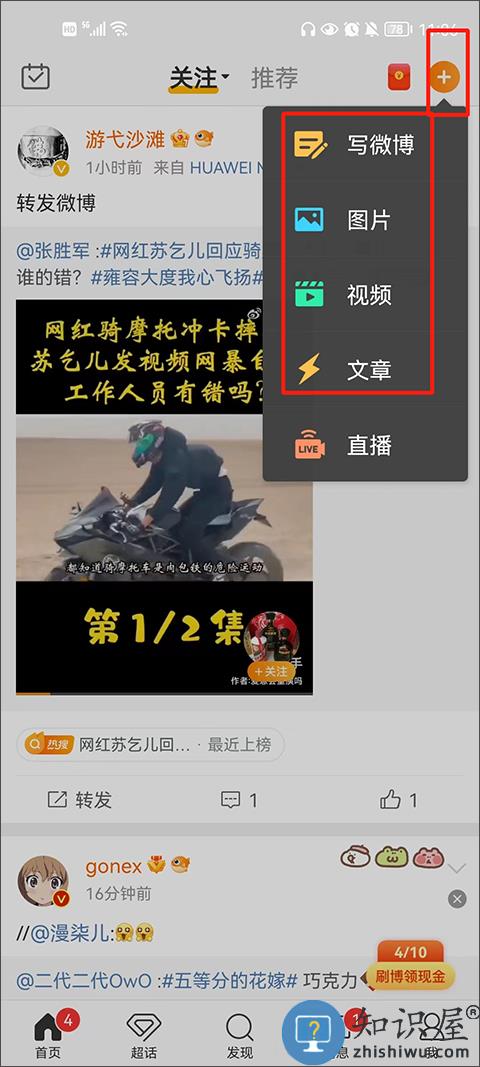 1、在手机端打开微博后,在主页的右上角会看到一个如下图所示的【+】,点击这个【+】;