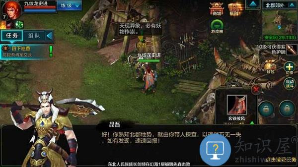 在选择好职业后进入游戏,1级主角的出生地在北郡,北郡也就是新手村,这时候开启第一章的剧情任务“三月无雨旱风起,重回华夏战女魃”。在北郡可以接取1-6级的主线任务,主线任务以介绍游戏世界观和新手操作引导为主,从第一个任务是“北郡惊梦”开始,一直到“意外遭遇”结束了北郡的主线任务。玩家只需要根据任务指引去做即可,完成任务就可以很快的将等级提升到6级,6级以后进入下一个区域。