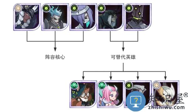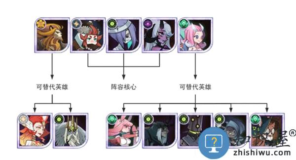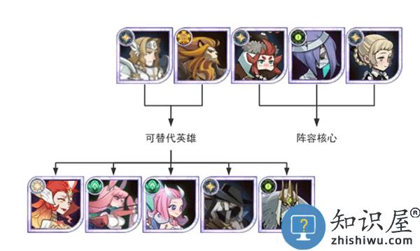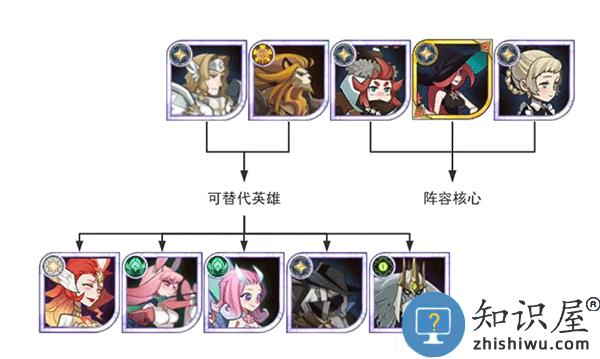 中期我们用商魅呆阵容,阵容成员:商人,狮子,呆萌,魅魔(紫品质魅魔即可上场,尽量追红色品质、30专属),蝴蝶,其中狮子和蝴蝶可以看情况换兔弓、骨弓、凤凰、奈拉、三眼、皮帕等英雄。