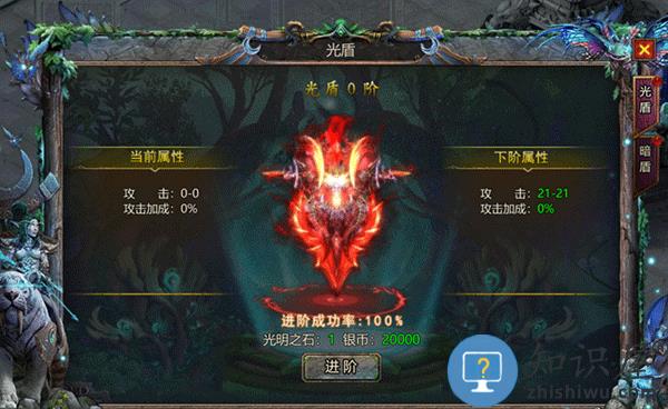 主打攻击加成,消耗光明之石、银币进阶光盾,进阶成功率:100%,进阶材料可从挂机打怪、击杀BOSS中获取,增加高额百分比属性。