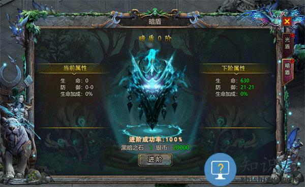 主打生命加成,消耗黑暗之石、银币进阶光盾,进阶成功率:100%,进阶材料可从挂机打怪、击杀BOSS中获取,增加高额百分比属性。