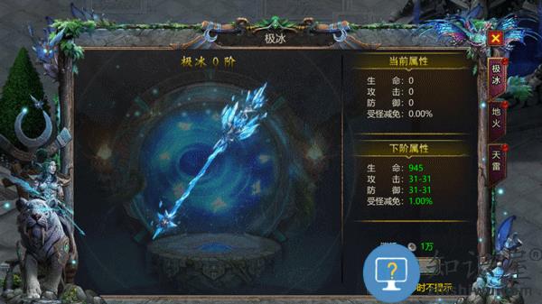 极冰主打攻击受怪减免,消耗相应银币升级法杖阶级,会提高生命、攻击、防御、受怪减免属性,银币可通过回收装备获得。