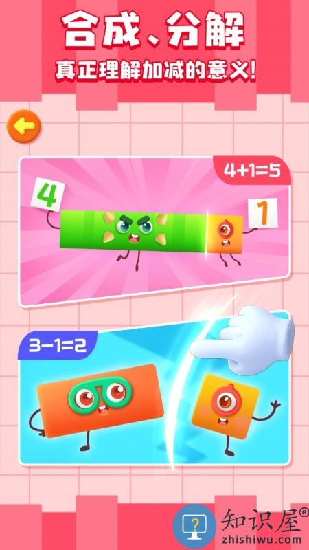 算数启蒙软件,软件拥有丰富的玩法,寓教于乐,可以帮助孩子更好的学习成长,了解数字精灵合成与分解的规则吧:产品中分别有10个代表数字1-10的数字图形,称为数字精灵。