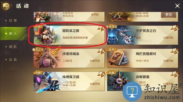 第一种方法是可以获得大量经验值的最简单的方法,点击右上角的“活动”,选择“学者课堂“,不管你答对或者答错,只要冒险家参与这个活动,都可以获得大量经验,答题界面左边的宝箱也会随这你答对题目的数量进行升级,玩家结束答题结束后获得相应的宝箱奖励。
