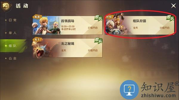 1、点击“组队狩猎”,组队完成狩猎任务,获得经验奖励。