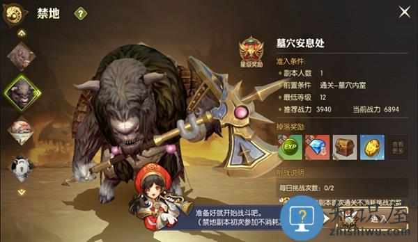 2、点击右上角“副本”图标,点击“禁地”,冒险家根据自身战斗力等级情况选择合适的副本地图,通过副本后即可获得经验(10w左右)和装备。每张副本地图只可一人参加并且每天仅有两次挑战机会。