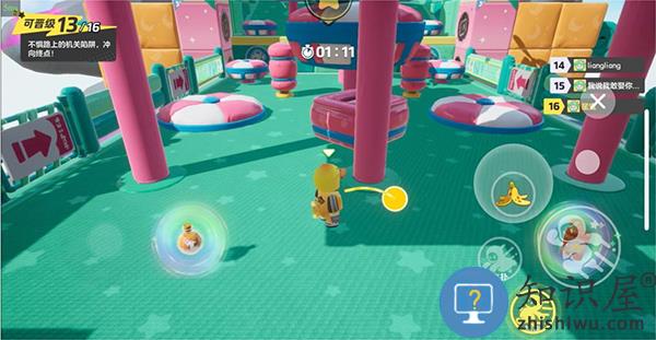 进入游戏,操作方面可以说跟蛋仔没什么差别,左边轮盘控制移动,右边分别为加速、飞扑、跳跃和道具使用。