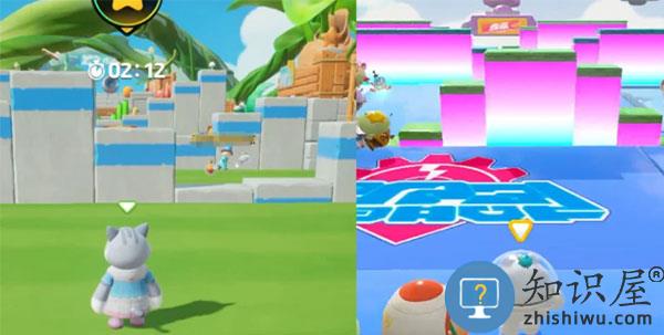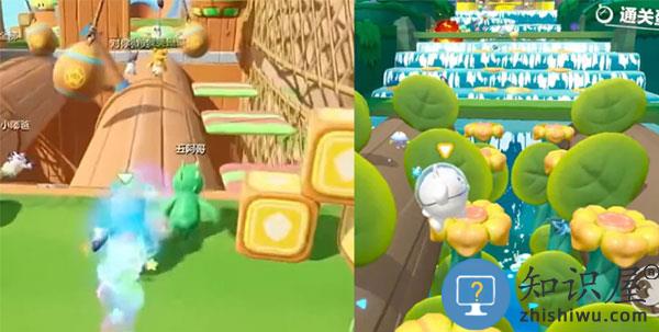 元梦【蹦蹦山谷】这张地图以山谷为背景,以弹跳为主要机关,另外加入了箱子、滚木、波形障碍等。而蛋仔的【山谷跃动】同样以绿意山谷和清泉瀑布为背景,同样是跳跃翻越地形,穿过滚木障碍。这两张图元素重合性略高,笔者觉得蛋仔的画面会更清新可爱一点。