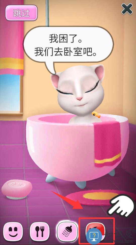 1、进入游戏小猫说困了,点击红色框框里的卧室并进入。