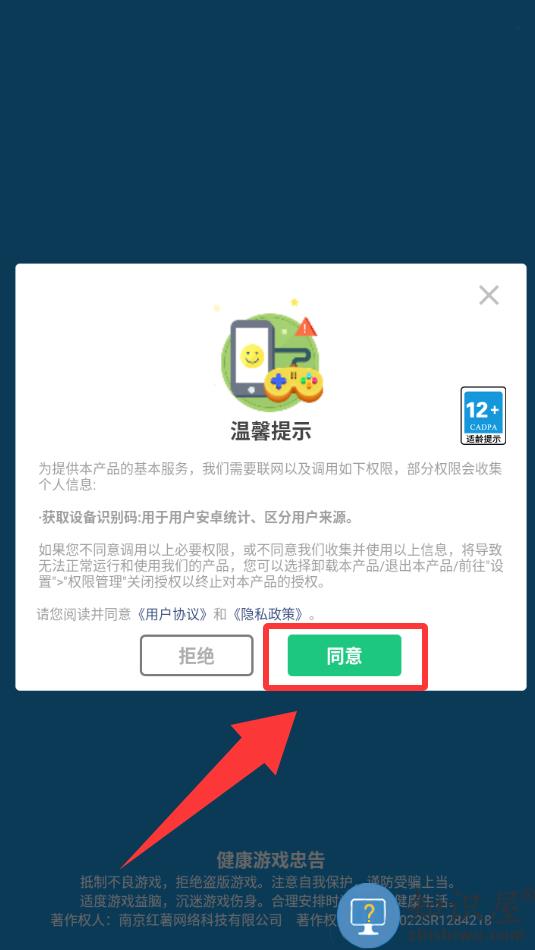 1、点击红色框框里的同意并进入游戏。