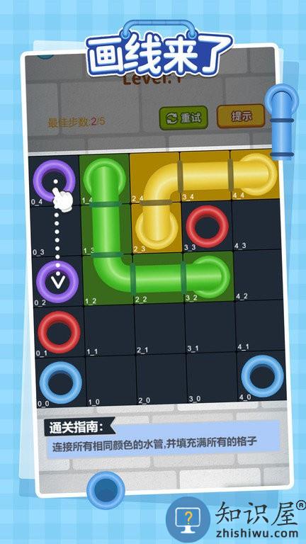 利用画线去闯关的益智类小游戏,操作简单,但挑战性十足。玩家需要根据图上所出现的圆圈的位置,把相同颜色的两个圆圈连接起来形成一条管道,直至所有圆圈连接完毕且画面中不留空格,即为游戏胜利。快来试试吧!