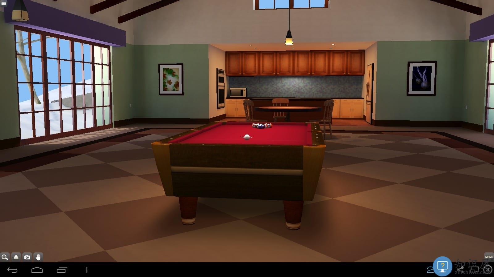 开启后通过滑动手指可以拉动镜头来观察游戏界面;第二个太阳按钮是调整周围的光线强度的;第三个眼球按钮是调整你的视角的;进入游戏后,在游戏界面下方是一排的击球设置选项,最左边的是放大缩小按钮,右边第一个是调整球杆与桌面的夹角的;第二个按钮是球杆击球的位置;第三个是击球按钮,你将所有的设置都调整好了以后,就可以点击“Shoot”.当没有点选下面的那一行中的任意一个按钮的时候,滑动屏幕可以调整球杆的方向.游戏玩法的多样性,包括美国8球、英国8球、9球等多达10多种玩法。