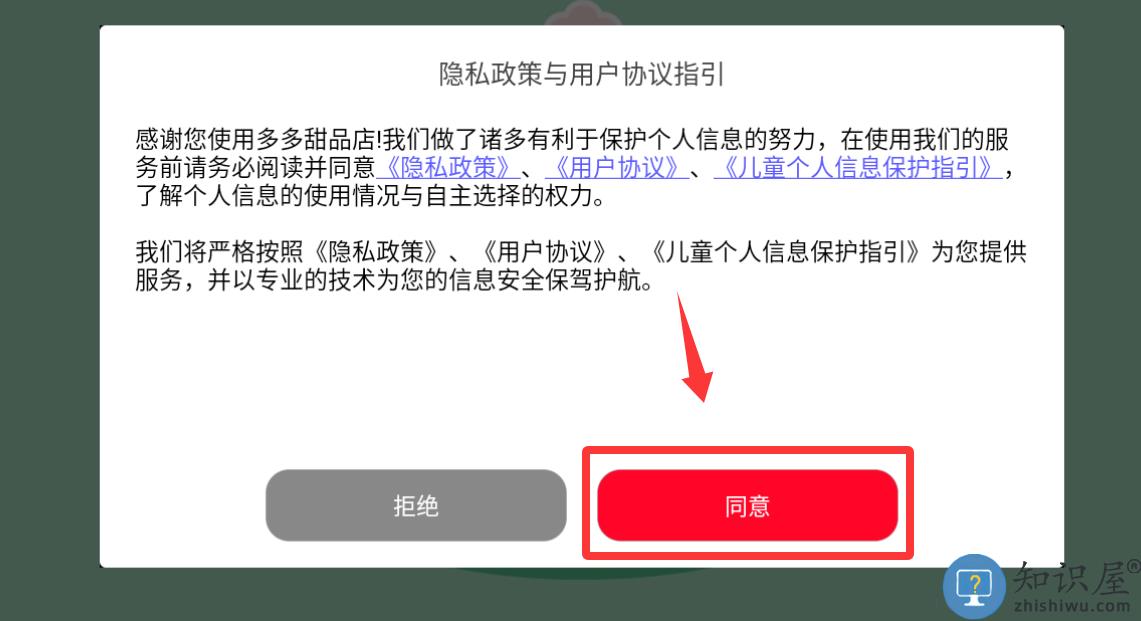 1、点击隐私政策与用户协议指引里的同意并继续。