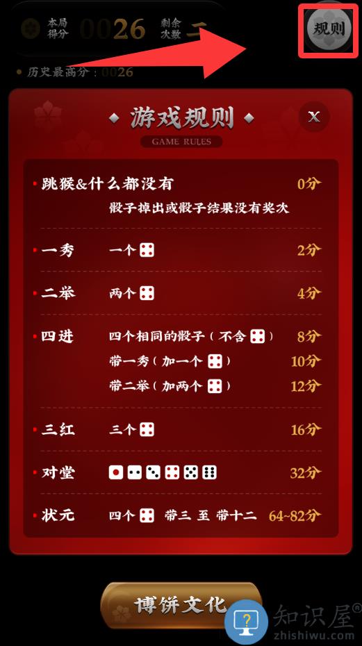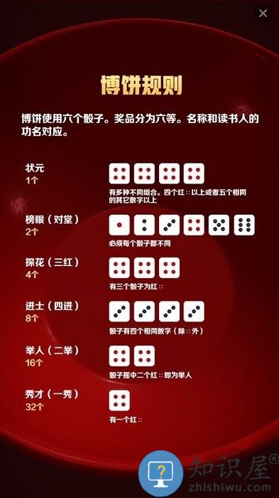 有1个“四点红”的得一秀饼;有2个“四点红”的得二举饼;有4个相同点数的(红四除外的都可以)得四进饼;有3个“四点红”的得三红饼。
