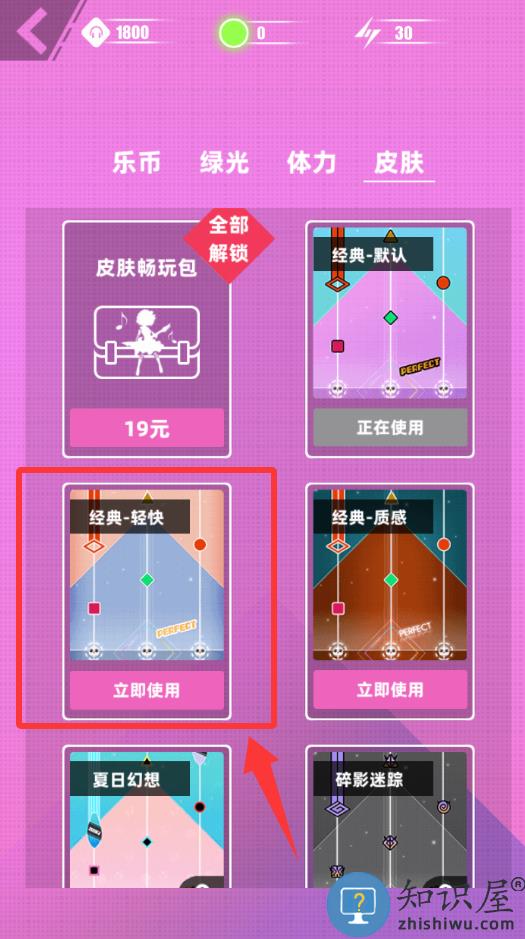 3、点击红色框框里的经典-轻快皮肤立即使用。