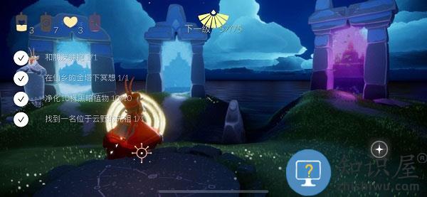 3、找到黄色人影,与它们互动 收集“光之翼”,我们的 飞行技能就可以得到 升级――斗篷背后 星星的数量就代表我们的飞行级别。