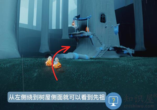 3、然后走到树屋左侧即可找到先祖,我们在正面是看不到的。