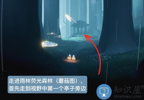 1、首先我们到雨林荧光森林也就是蘑菇图,走到如图所示的第一个亭子那里。
