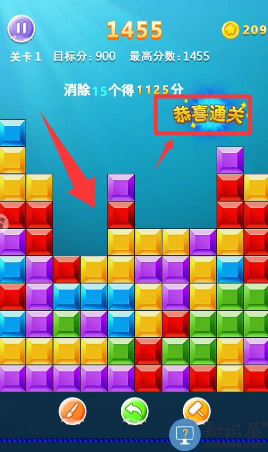 3、恭喜你过关了,现在把剩余的方块消灭掉吧。