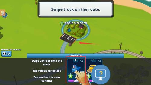 3、从停车场滑动卡车到苹果园路线,按照2m/3m距离选择车辆。