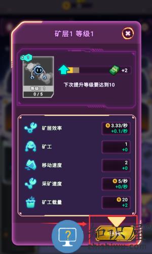 1、点击红框标注的升级矿层按钮,花费20金币提升矿层等级。