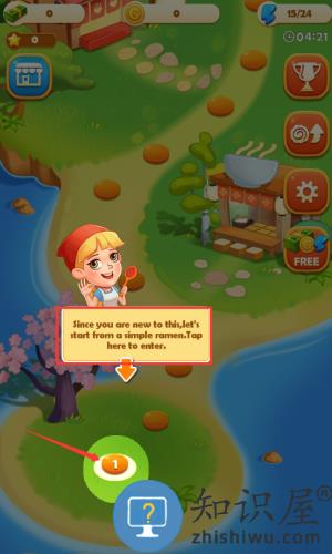 2、根据新手引导和角色提示,点击红色箭头所指的绿色数字1按钮,从简单的拉面订单开始。