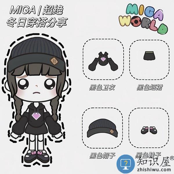 4、黑色卫衣+黑色短裙+黑色帽子+黑色鞋子。