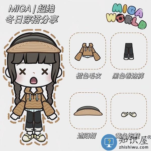 6、橙色毛衣+黑色卷边库+遮阳帽+黄色拖鞋。