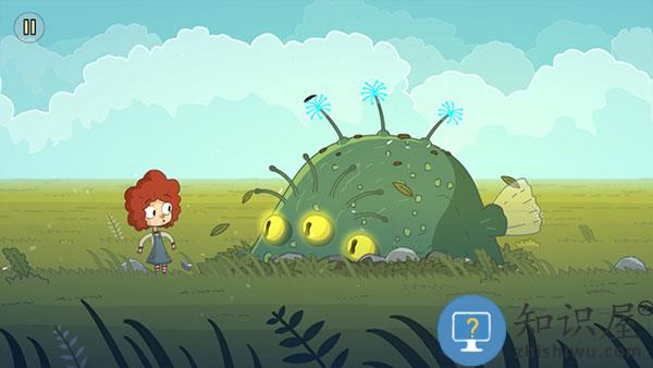 7、继续向右,三个花朵点亮出现三只眼怪兽,点击它,小女孩会抚摸它。