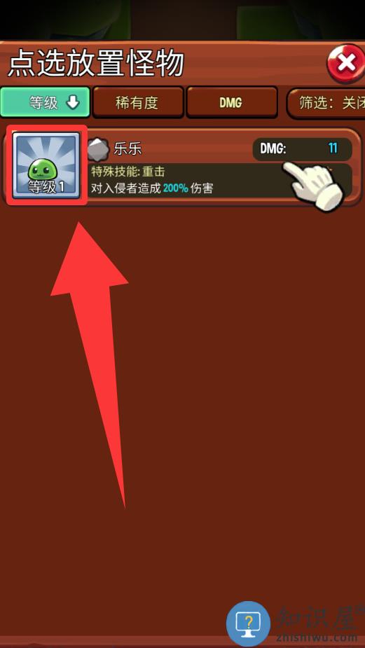 3、点击红色框框里的乐乐把它升级增加战斗力。