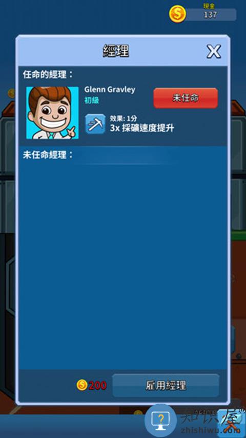 3、升级到5级的时候,大家就可以雇佣经理了,矿区经理,电梯经理和地面经理,都是一百金币,经理的作用就是一直监督工人干活,可以使玩家们不用一直点击工人干活,这个时候挂机他们也会自动干活。随着矿区2的开采,经理的雇佣价格也会相应的变高。矿屋1等级为10的时候,地下的矿中就会出现两个黄色衣服的矿工,一次可挖94个金币的矿石。