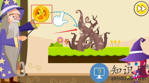 2、按照箭头指引用火焰魔法点燃枯树,完成元素互动教学。
