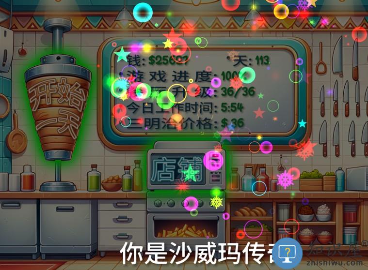 当你解锁了所有科技后,要求你再赚25000块钱,而你解锁所有科技后,一天的收入在2300左右,13天内即可完成,此时画面背景会变暗,不断放礼花,字幕出现“你已经是沙威玛传奇”字样,此时虽然主页面灰暗,但其余按钮还可以正常点进去,或者退出或者新的营业一天。