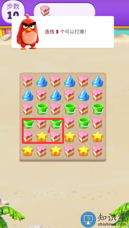 3、进入游戏把粉色蛋糕移动下面进行3消。