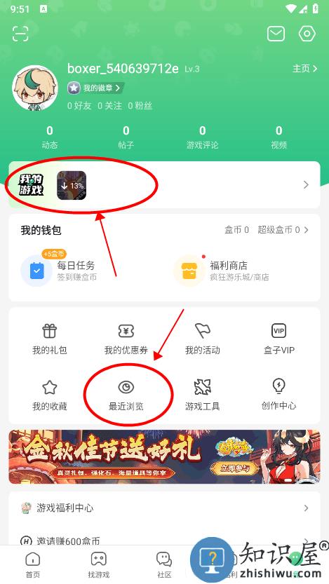 在我的界面,点击我的游戏和最近浏览即可查看;