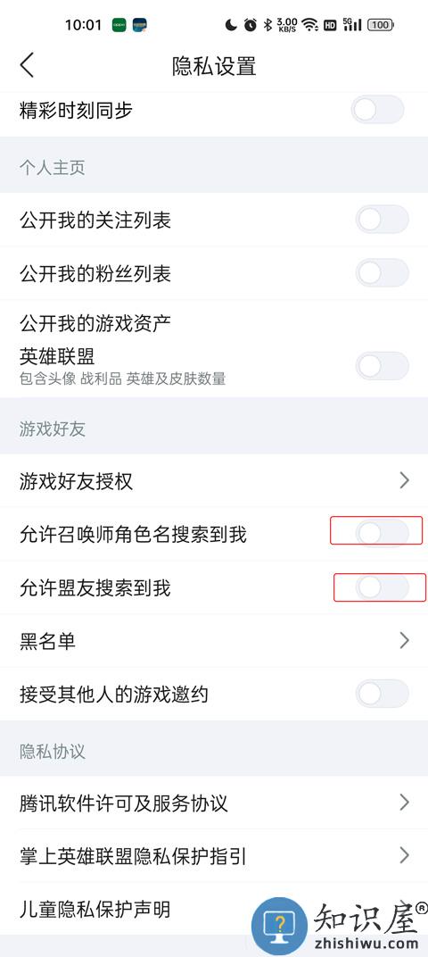 4、在游戏好友这一栏找到,允许召唤师搜索到我和允许盟友搜索到我点击关闭,这样其他人就无法搜索到你查看战绩了。