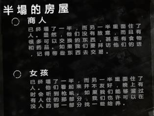剧情二:交易商,显示可能的交易,从右侧进入地图,可以挖开一楼的废墟进入左边房子搜寻物资,也可跟二楼的商人交易,不建议放养