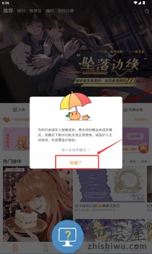 3、阅读青少年模式说明后,点击红框标注的橙色知道了按钮。