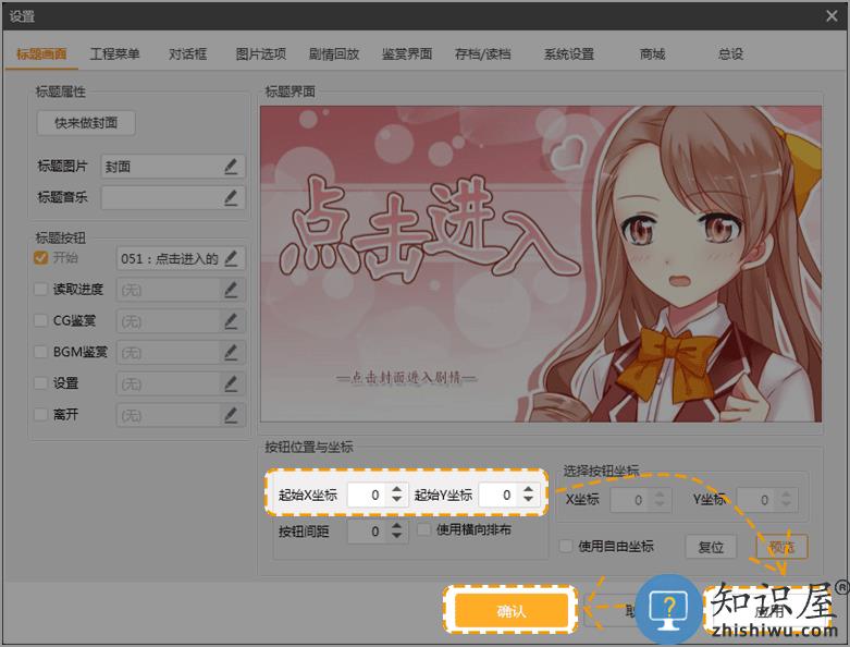 调整开始按钮坐标为“X:0,Y:0”,点击“应用”,点击“确定”。这里我们需要注意的是,开始按钮坐标位置必须为“X:0,Y:0”,否者封面按钮无法铺满画面。