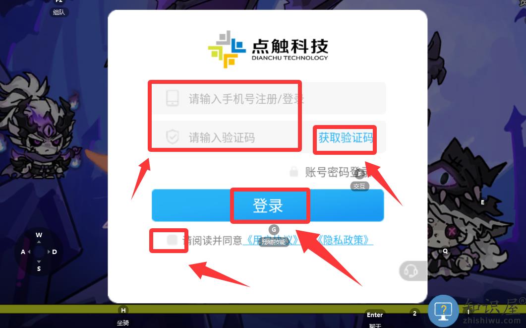 3、输入手机号码获取验证码然后打√并登录。